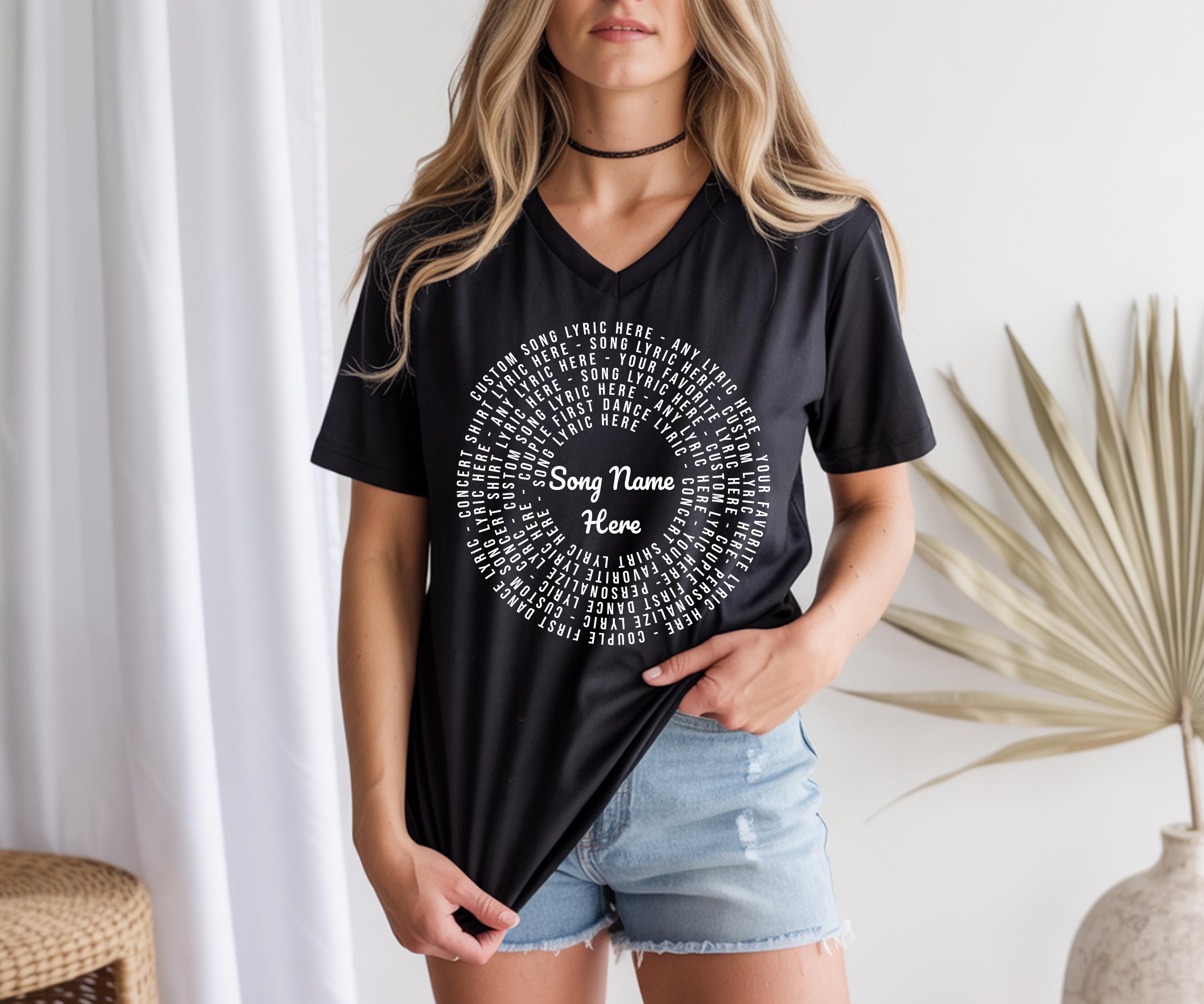 Celebrate your favorite memories with a custom song lyric shirt designed just for you. This women’s relaxed V-neck tee combines comfort and style, perfect for anyone seeking a unique lyric gift that speaks from the heart. Whether it’s a first dance shirt or a tribute to a beloved artist, this music lover gift transforms meaningful words into wearable art.