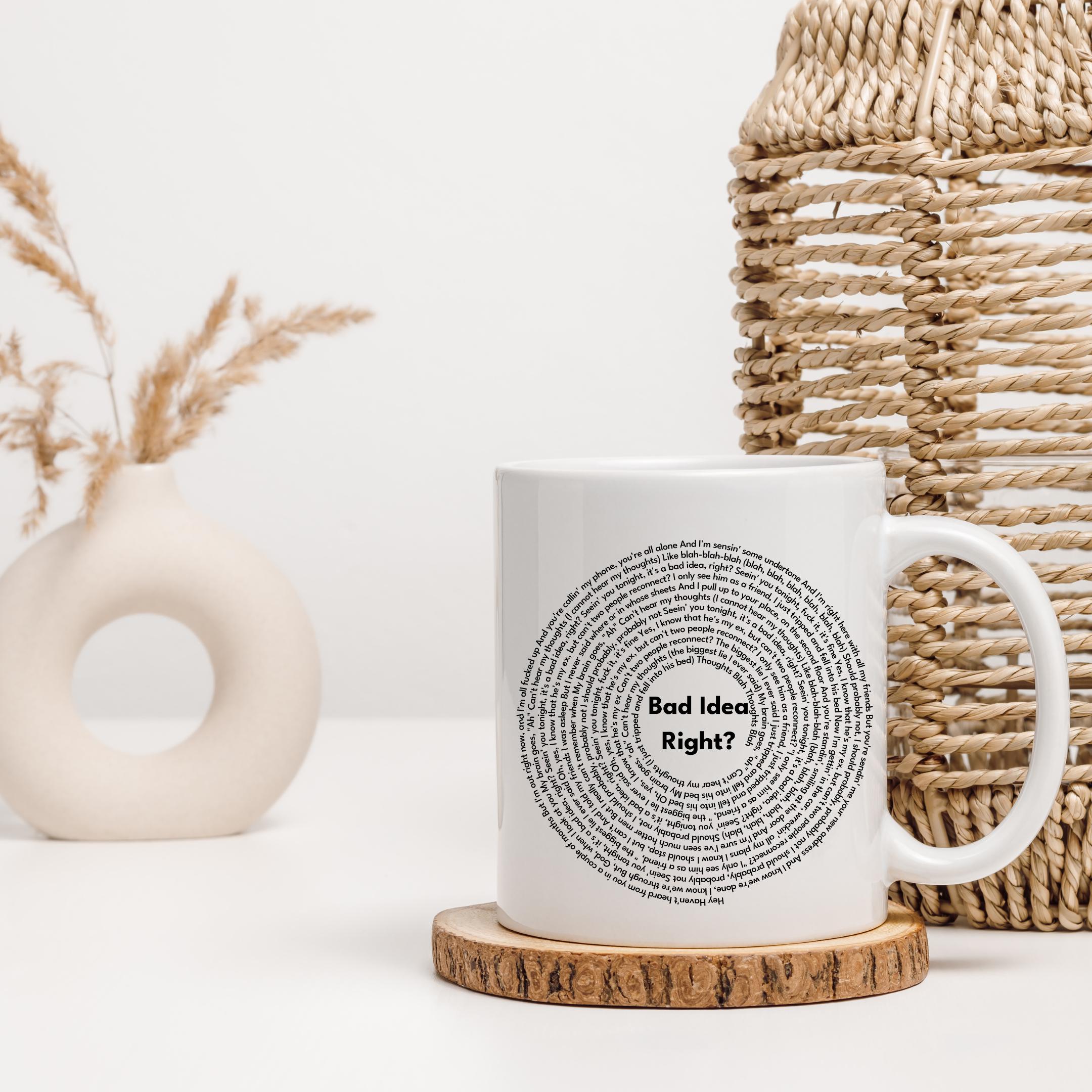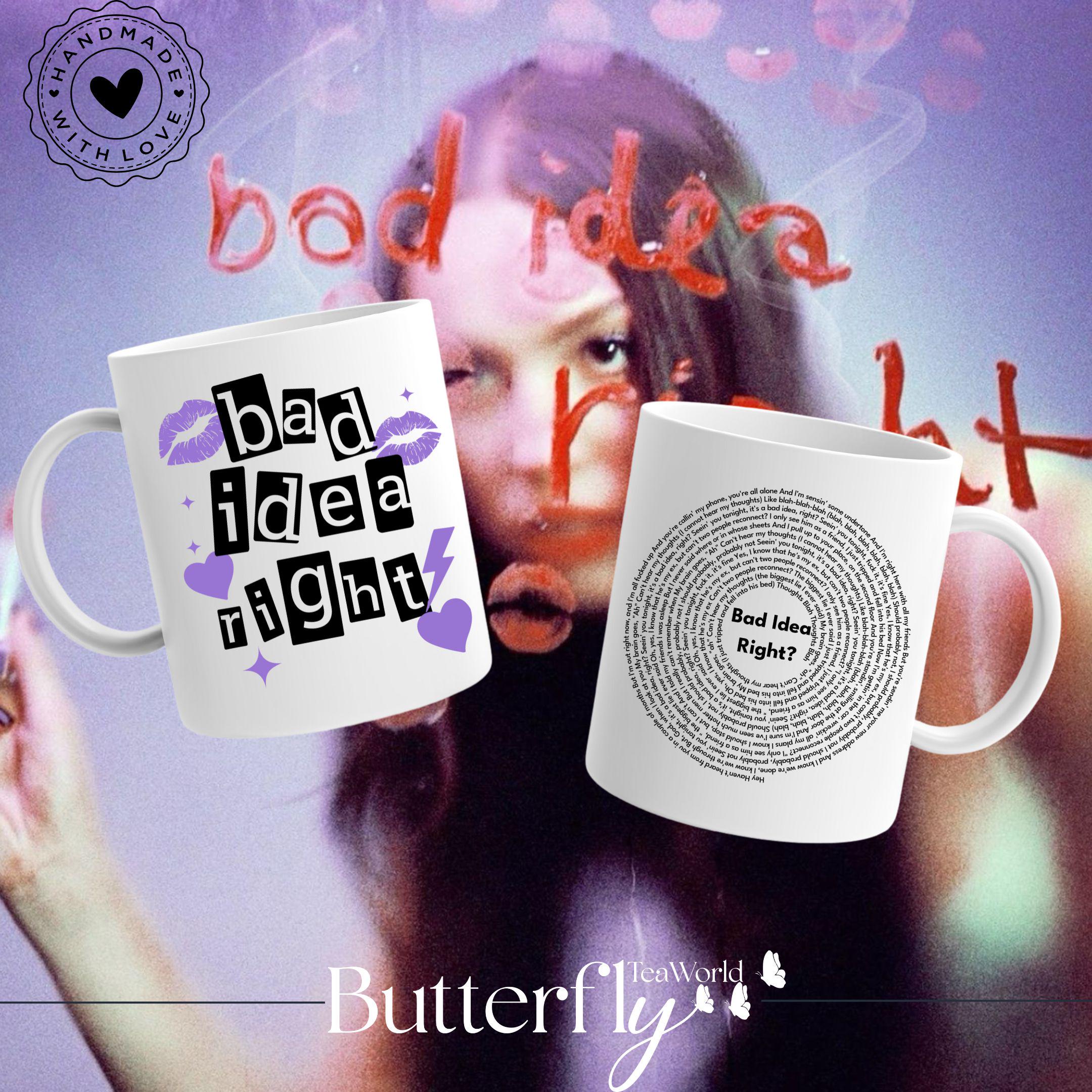 Celebrate your love for Olivia Rodrigo with this beautifully crafted coffee mug inspired by her hit song Bad Idea Right. Designed with music lovers in mind, this 11oz ceramic mug features an accented C-handle that adds a stylish pop of color, making it a standout piece in any collection. Whether you're sipping your morning brew or searching for the perfect Olivia Rodrigo fan gift, this lyric mug combines functionality with trend-forward design.