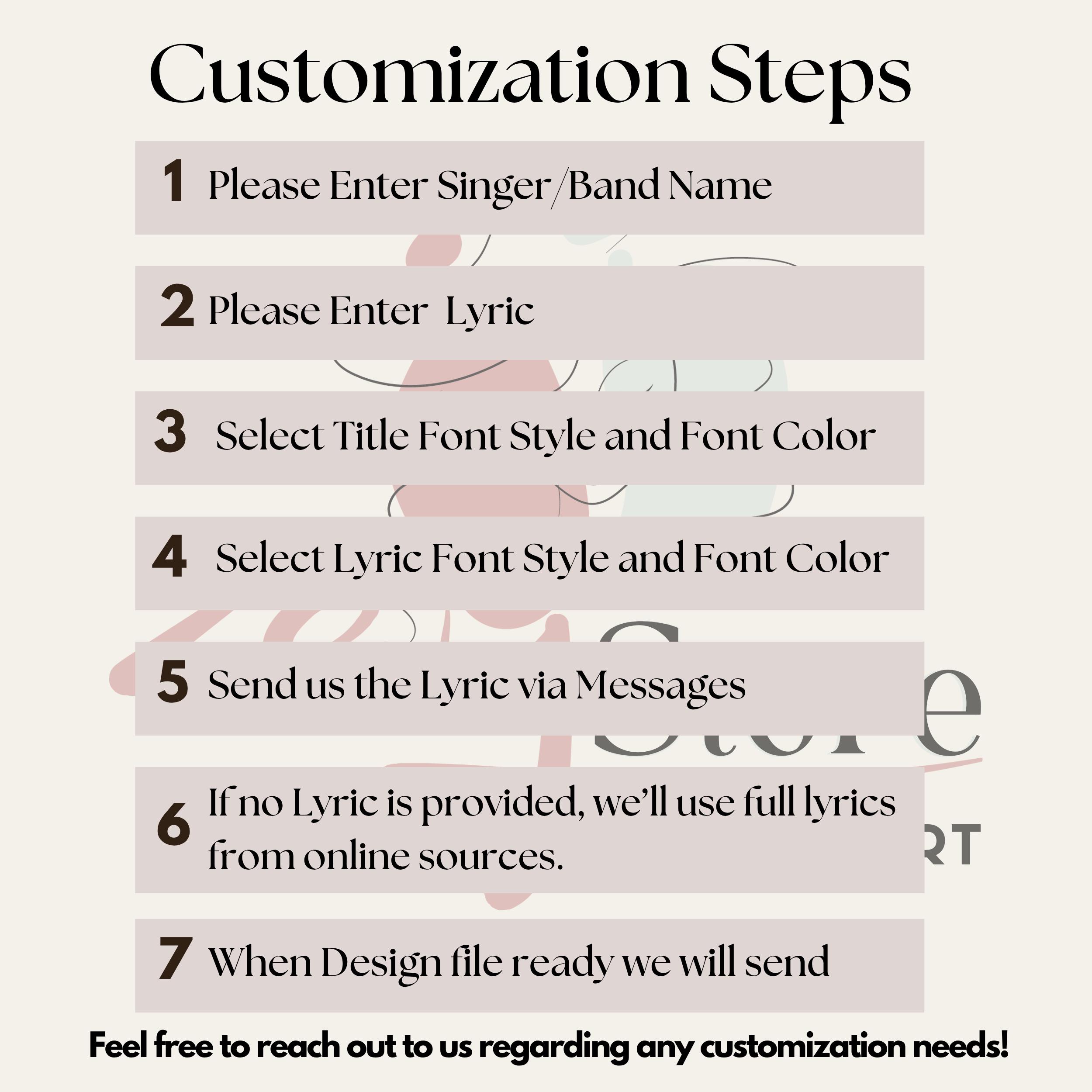 - 1. Provide your desired song title, artist, and exact lyric in the personalization box or contact us after purchase