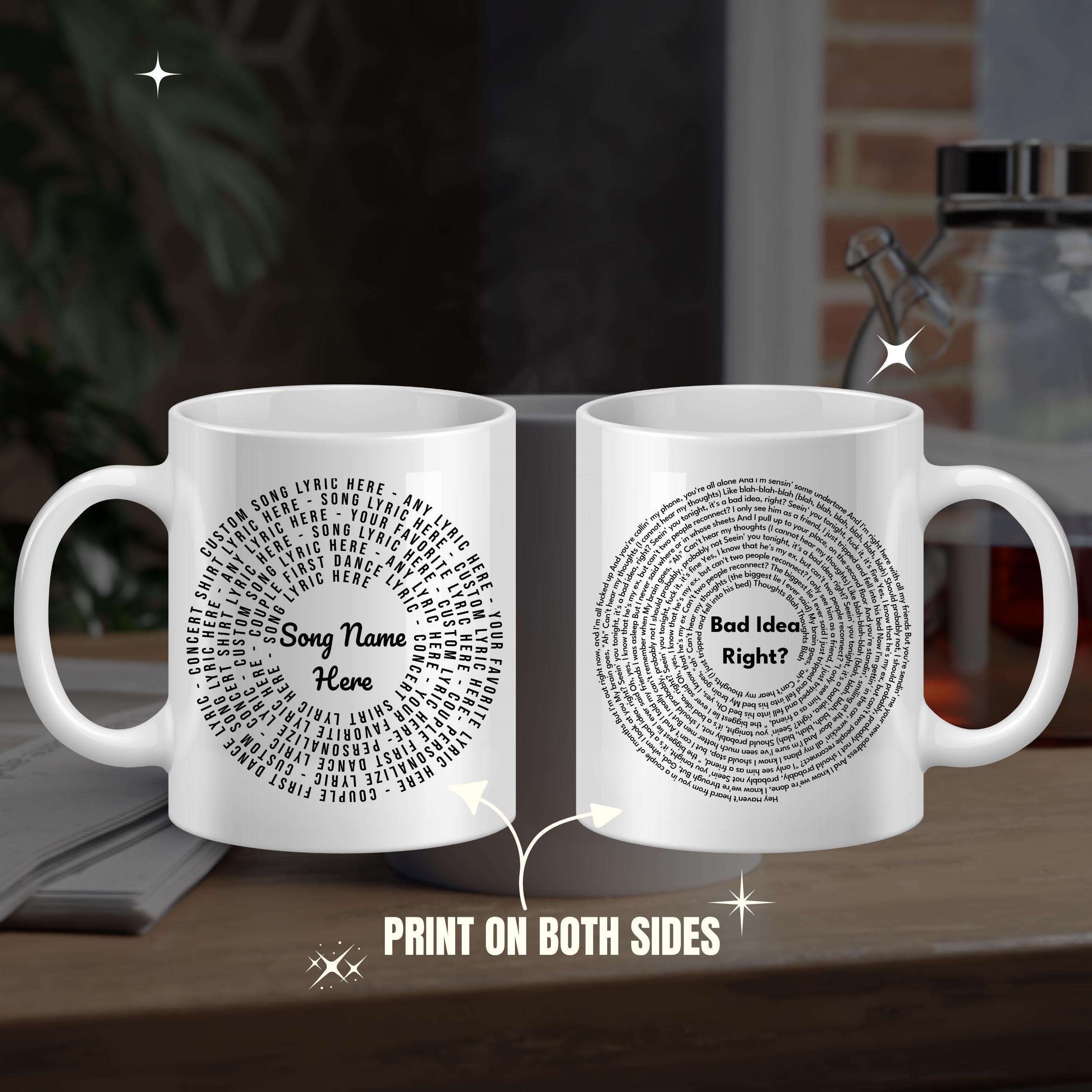 Start your mornings inspired with a custom song lyric coffee mug designed especially for music lovers. This ceramic coffee mug features a stylish vinyl design shape that beautifully highlights your favorite lyrics, making each sip a personal celebration. Whether you choose the classic 11oz size or the roomy 15oz accent mug, it’s a perfect way to enjoy your coffee while showcasing your passion.