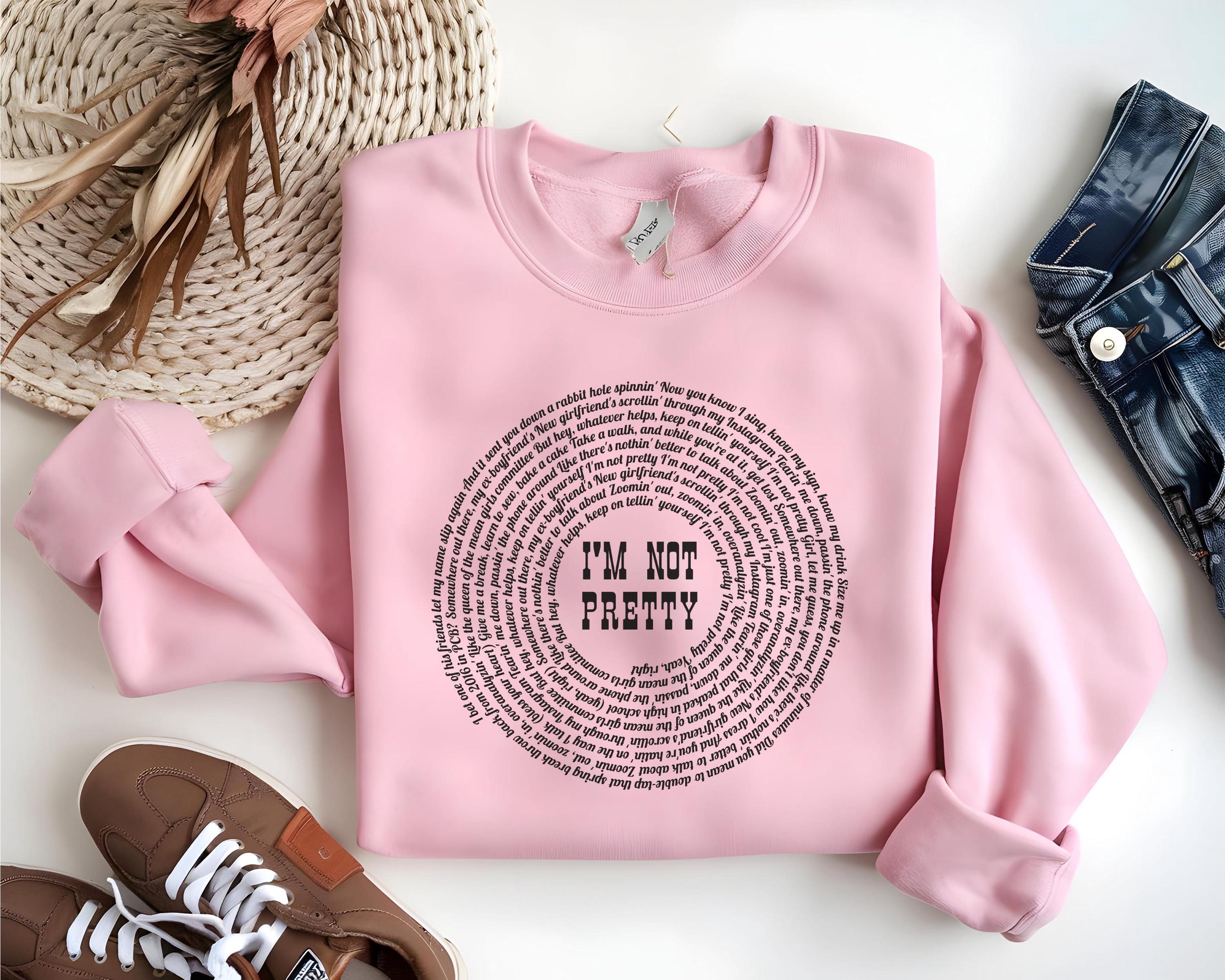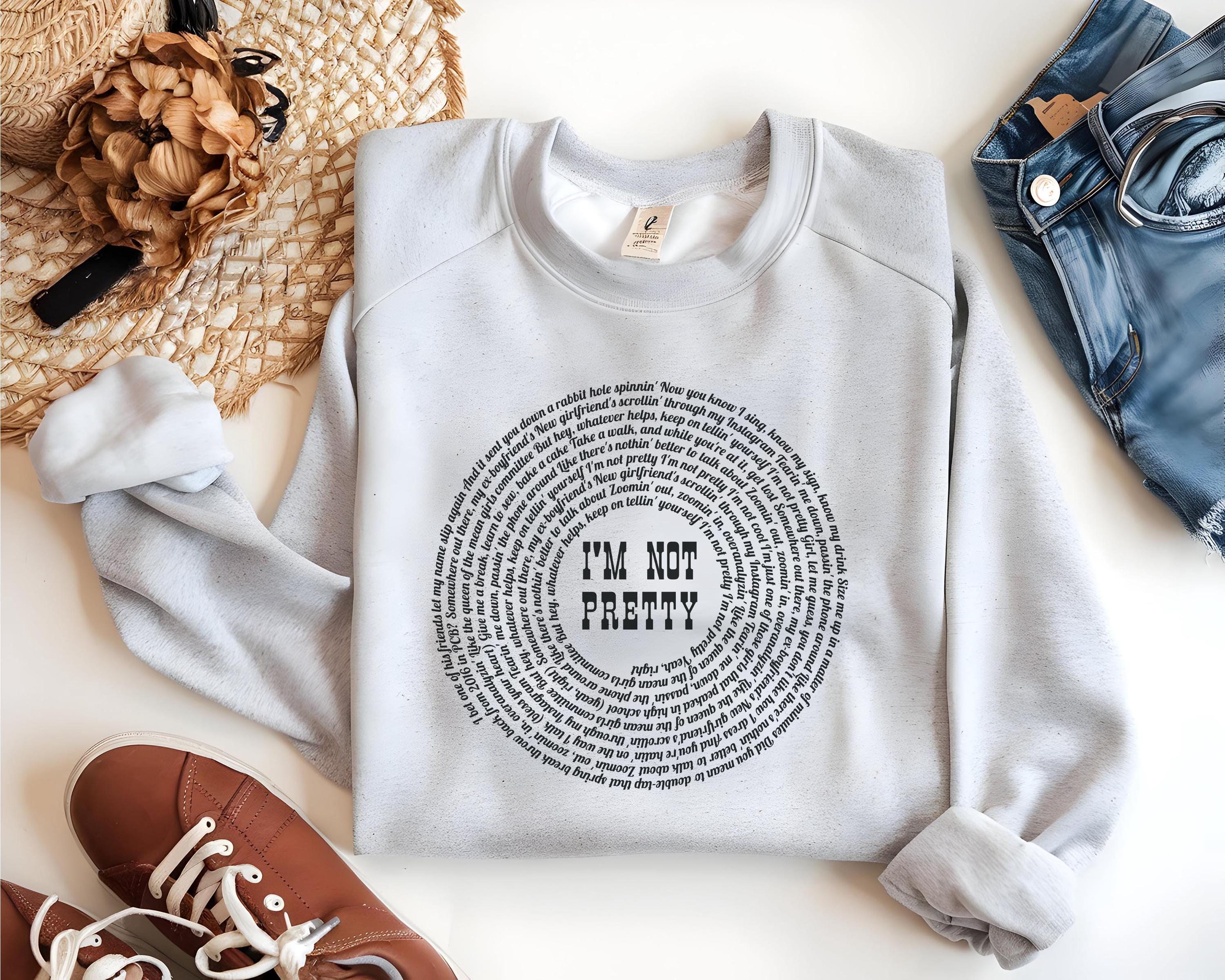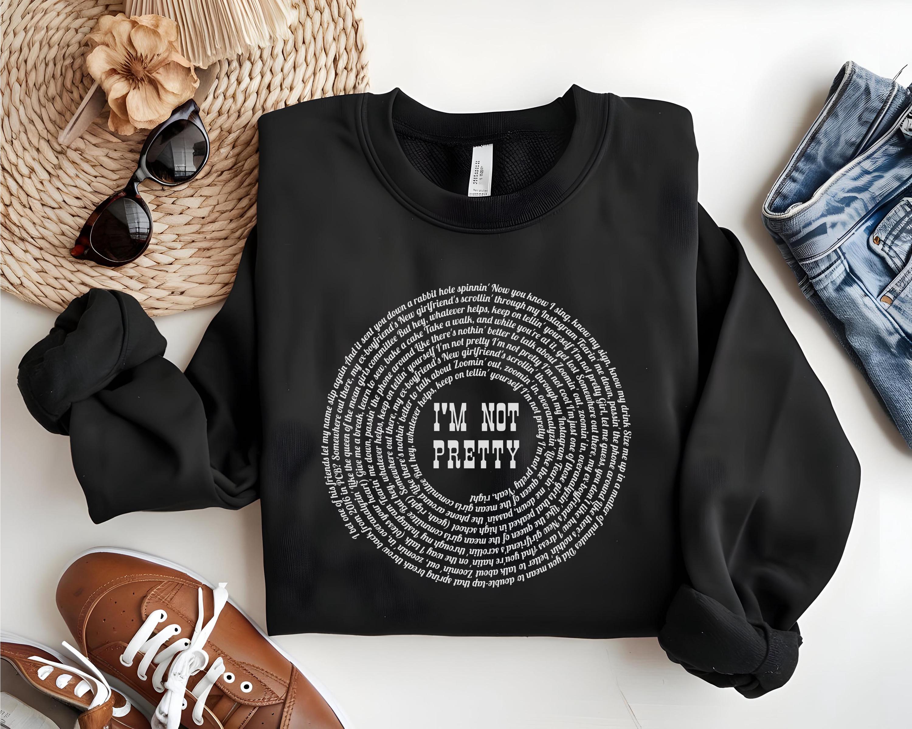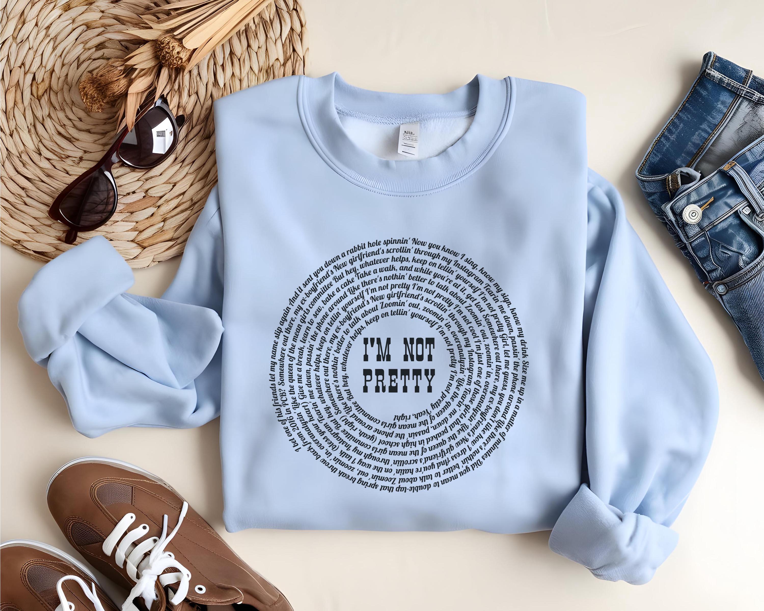 Stay cozy and stylish with this “I’m Not Pretty” inspired lyric sweatshirt, perfect for country music lovers and M. M. fans. Designed on the popular Gildan 18000 crewneck, this sweatshirt features a unique circular lyric design with bold center text for a trendy, aesthetic look.