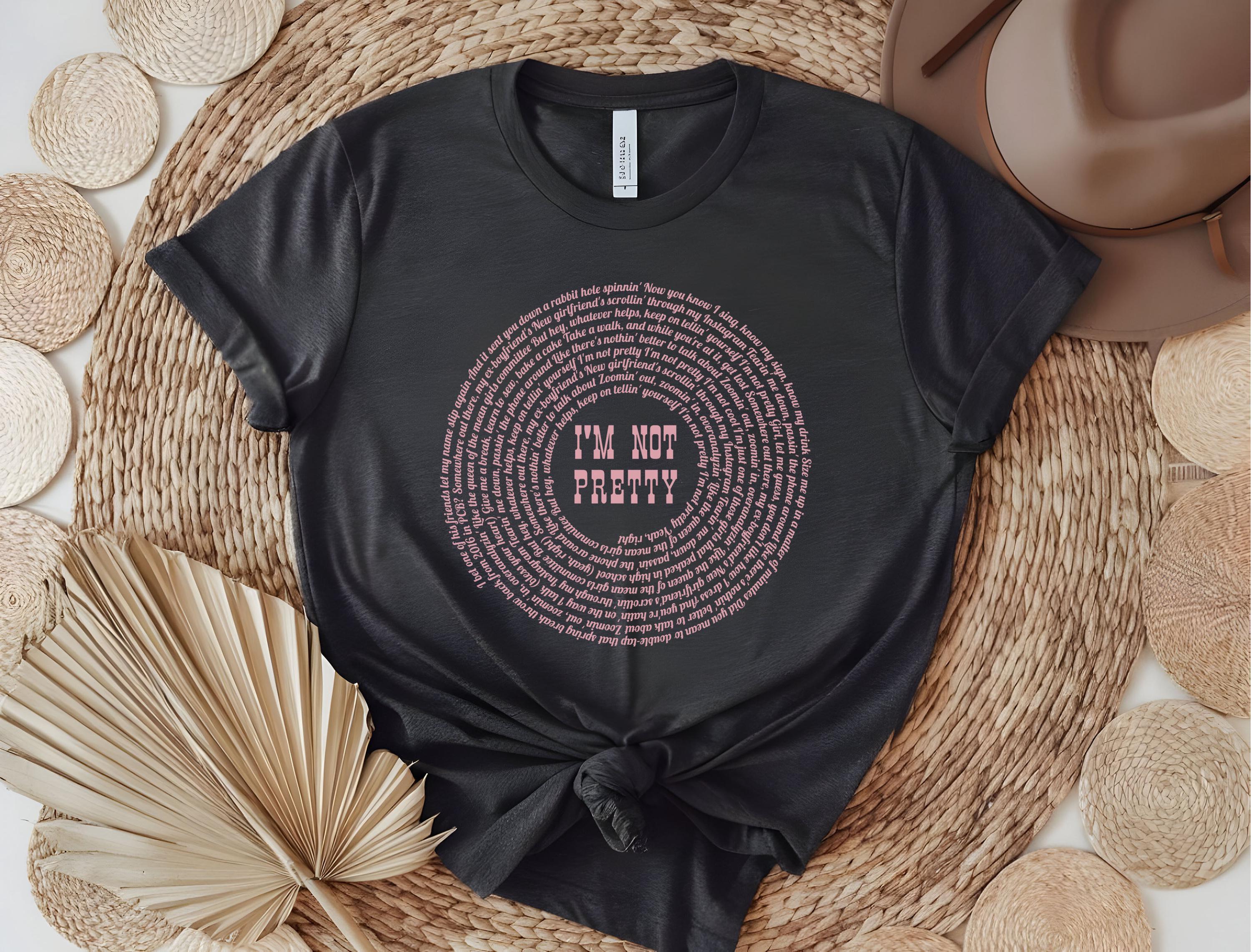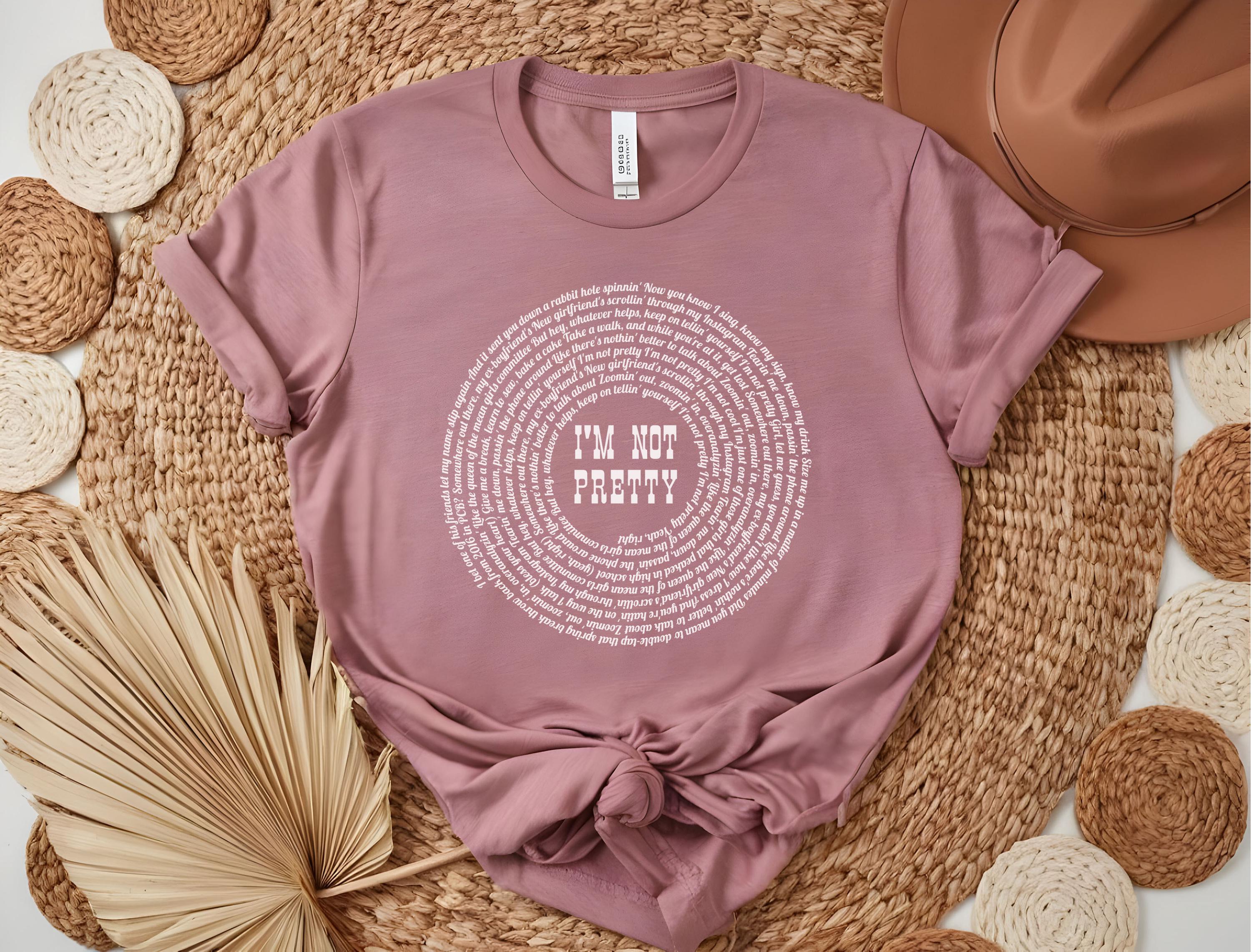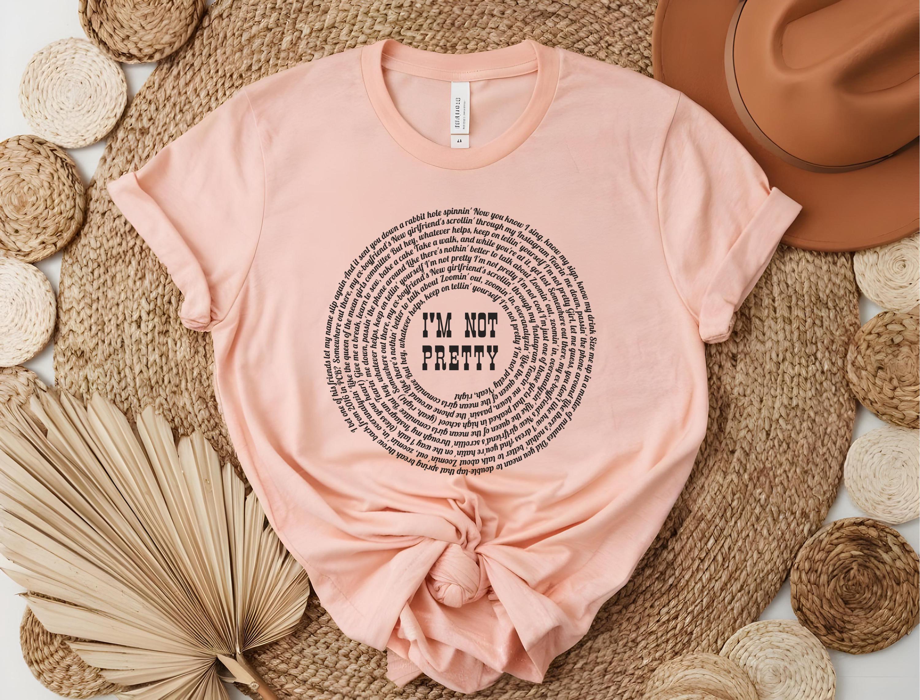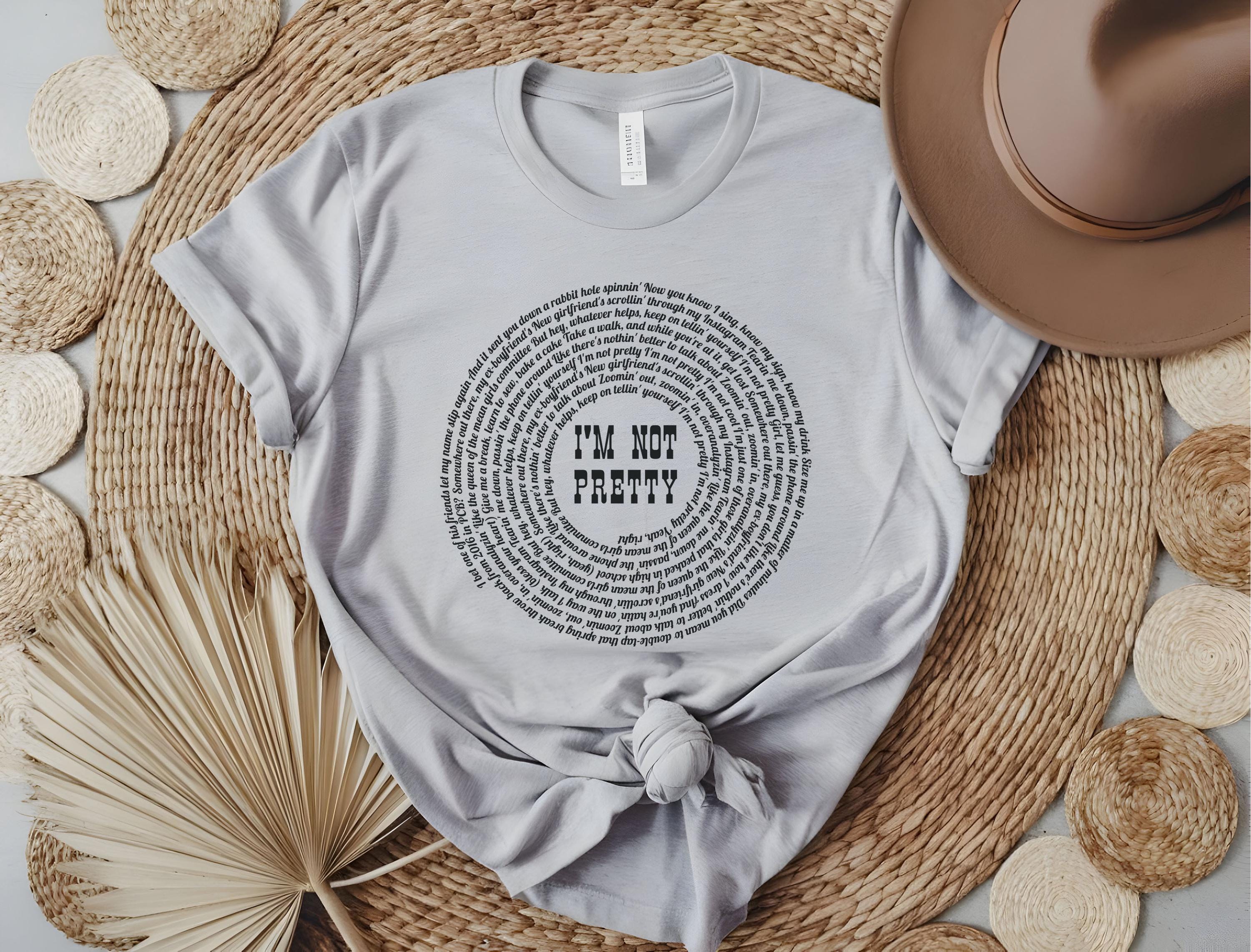Show your love for country music with this “I’m Not Pretty” inspired lyric shirt, perfect for fans of M. M. and trendy western style. This design features a bold statement center with a stylish lyric layout, creating the perfect concert-ready look.